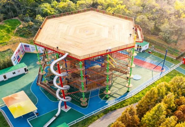 聚宝山内设大型无动力高空挑战项目——金陵矩阵, 包含高空秋千、高空滑道、旋转滑降等多个挑战单元, 兼具刺激性与观赏性。