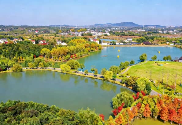 赏心谷整体坐落于龙山山系腹地,园区内湖泊、草坪、林地交错分布 ,空气清新、视野开阔,极具度假与放松属性。