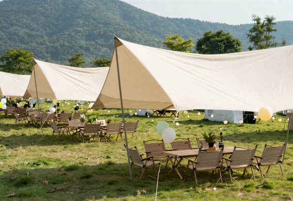 精致体验:天幕/帐篷/灯串/氛围餐具与野餐陈列,舒适度与仪式感兼顾。