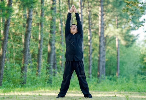 ① 两手托天理三焦(开身立脊,协调上下)
