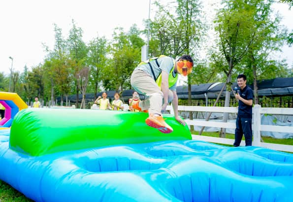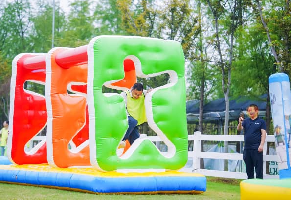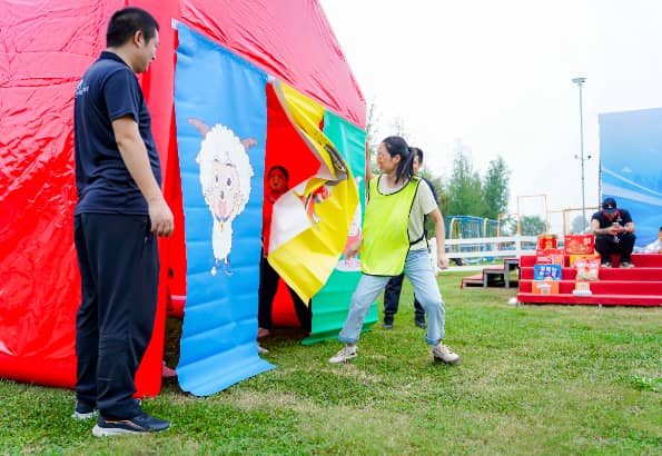 巨型不倒森林:全员手扶充气柱,按口令顺时针换位扶柱,完成规定次数;柱子倒地需重计次数、计时不停,需保持指定间距与规范动作。